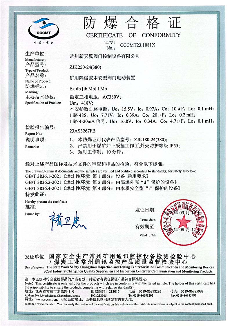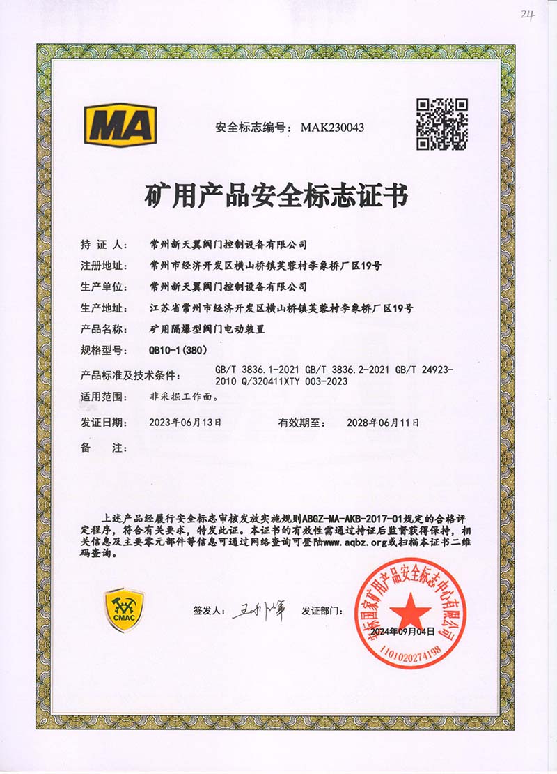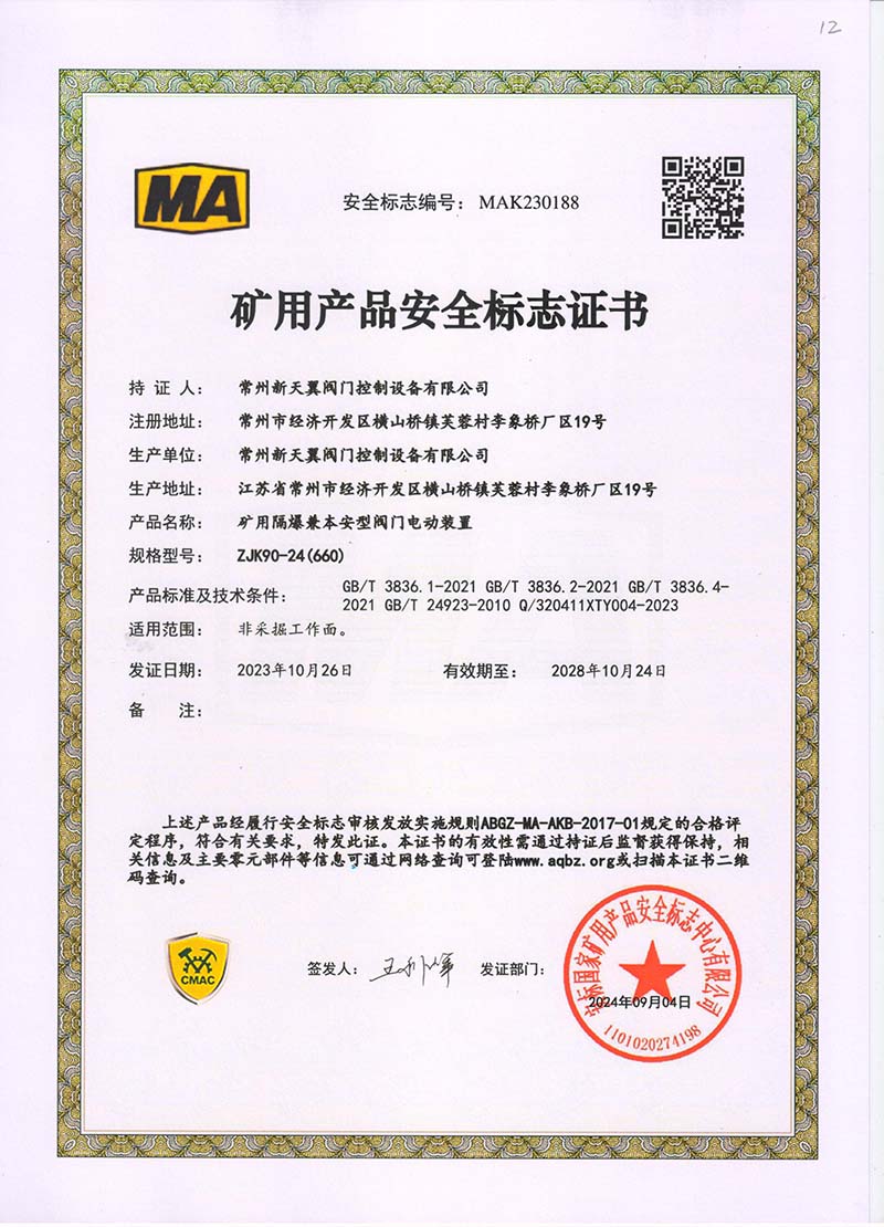 礦用產(chǎn)品安全標(biāo)志證書ZJK180-24(380)