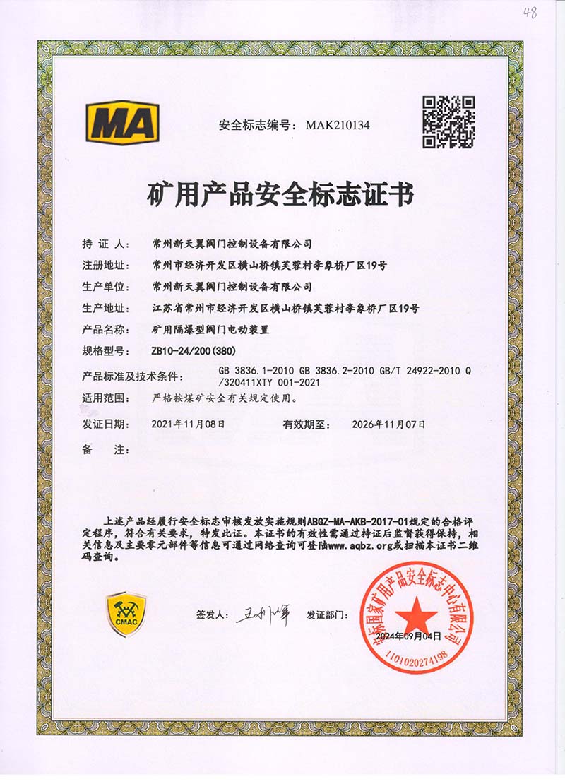 礦用產(chǎn)品安全標(biāo)志證書ZJK60-24(380)